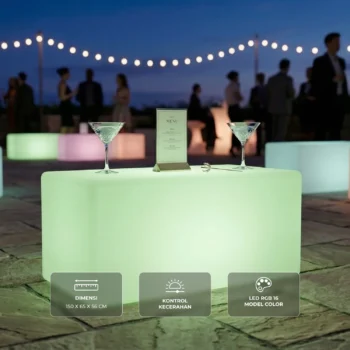 LED furniture ini sangat cocok untuk dekorasi indoor maupun outdoor, dengan bentuknya yang unik membuat nuansa yang berbeda dengan fungsi yang dapat dimaksimalkan dengan kebutuhan acara Anda.